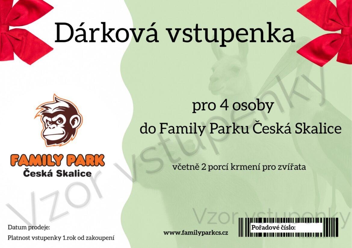 Slouží jako skupinová vstupenka pro 4 osoby do našeho Family parku. Stejně jako certifikáty je možné dárkovou vstupenku objednat telefonicky nebo mailem. I zde platí platnost 1 rok ode dne nákupu.